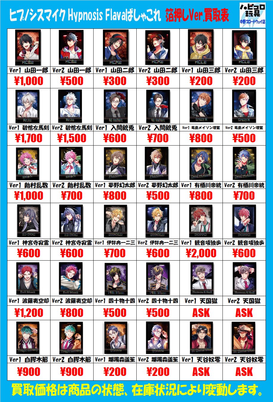 | 商品の特徴 | ヒプノシスマイク ぱしゃこれ Flava Ver.1 ver.2 観音坂独歩 伊弉冉一二。ヒプノシスマイクflavaぱしゃこれVer.1.2 ヒプノシスマイクflavaぱしゃ。ヒプマイ ぱしゃこれ BOX Flava|Yahoo!フリマ(旧PayPayフリマ)。ヒプマイ】Hypnosis Flava 2 ぱしゃこれ 神宮寺寂雷セット - メルカリ。ヒプノシスマイクflavaぱしゃこれVer.1.2を5パックずつ10計パックです此方バラ購入未開封品なので箔押しの有無はわかりかねますのでノーマルのみと思っていただければ幸いです箔押しがでないなどのクレームはお受けできかねますVer1のみVer2のみも対応可能です期間限定\1666複数セット購入可能#ヒプノシスマイク#ヒプマイ#ぱしゃこれ | ||