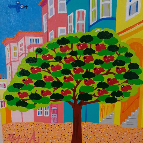 - 美術品・アンティーク・コレクション > 絵画 > サンフランシスコの赤い鳥とハッピー太陽 F4号 アクリルガッシュ作品 サンフランシスコの赤い鳥とハッピー太陽F4号アクリルガッシュ作品
