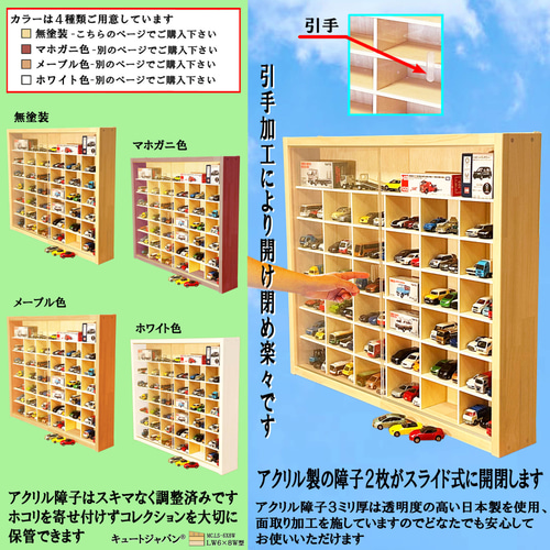 | 商品の特徴 | ミニカーケース トミカ108台・大型サイズ対応 1/64 アクリル。木製ミニカーケース 80台 アクリル障子付 トミカ コレクション 日本製。ミニカーケース トミカ108台・大型サイズ対応 1/64 アクリル。【夏休み数量限定値下げ】通常価格 17,820円 → 16,820円【本体サイズ】 巾734ミリ/高さ594ミリ/奥行113ミリ。ミニカーケース トミカケース アクリル製 5×10マス 最大100台収納。【マス目寸法】 巾111ミリ/高さ70ミリ/奥行80ミリ。MiniGT LBWK ランボルギーニ ウラカンGT #126/129セット。【大型サイズマス目】巾694ミリ/高さ94ミリ/奥行80ミリ。VW ビートル ブリキ 約28cm。アクリル障子付、収納ケース 未使用製作品です。ヴェルファイア カラーサンプルミニカー 非売品 ホワイトパール 色見本 茶箱。ミニカーが1マス縦に3台収納、最大108台収納可能、大型サイズも収納できます。トミカプレミアム10周年 日産 GTR。トミカ(箱入り)がゆったり前後に収納できます。ロングトミカ 建設重機 3種セット。外枠にメルクシパイン集成材・中桟にラワンベニヤを使用しています。GCD ゲインコーププロダクツ リバティウォーク 三菱ふそう スーパーグレート。天然素材の木の香り、ぬくもりを感じられます。BMW X5 1/18 ダイキャスト ホワイト。アクリル障子は透明度が高く、大切なコレクションをホコリや傷から守ります。ミニカー KYOSHO BMW 750Li (F02) 1:18。大事に保管したい皆さまにご満足いただける一品と自負しております。MINIGT 松田次生直筆サイン R32 TAS2025 東京オートサロン限定。コレクター様に『こんなの欲しかった!』 そう言わせたい一心で製作しました。PIXAR ホットウィール ミニカー 5点セット。アクリル障子付ケースは3割を超える方がリピート(感謝!)されています。トヨタ 新型 RAV4 2019 1/18 ダイキャスト ミラノカーキ 合金製。ありがとうございます。【4台セット】レイズ クラウン パトロールカー 180系 1/64。お片付けが苦手なお子様にも楽しみながら整理上手に・・。ミニカー 1/43 BMW Z4 GSR HATSUNE MIKU 2012/ EBBRO。プレゼントにもおすすめです。京商 カルソニック スカイライン GT-R 1/18 日産 NISSAN。ミニカーは付属していません、ケース本体のみの販売です。スズキ 新型ラパン プルバックカー [新品·未使用] シルバー 非売品。購入時の注意点:材料は建材を使用していますが、表面は天然木のため色目・木目・節の具合がその都度変わります。mitsuhiro970・1/43展示14台可能・ディスプレーBOX。天然単板独特の節目・木目の濃淡・接ぎ目が目立つ場合がありますが、構造上問題はありません。トミカ ランボルギーニ LP700。製作では裏面の意匠は視覚的に重要視していません。タカラトミー スヌーピー SECRET AGENT。ご了承ください。Taka・USB・1/43仕様・ディスプレーBOX/ネオジオラマ。●スライド式障子は光線透過率93%の高品質アクリル板3ミリ厚を使用しています。ignition model あぶない刑事 日産レパード XS-Ⅱ 紺。引手加工をほどこしていますので開け閉め楽々です。ホットウィール ジャパンコンベンション シェビー シルバラード 右向き。●外枠に木目を活かしたパイン集成材を使用しています。トミカ ロング まとめ売り 20台 セット。長年お使いいただけるよう頑丈な造りとなっています。【限定700台】京商 1/18 トヨタセンチュリーGRMN ホワイト 送料無料。※中桟は固定式で可動はしません。レッドブルF1 1/18 マックス・フェルスタッペン メキシコGPウィナー。サイズをご確認のうえご購入ください。ディアゴスティーニ エンツォ 1/10。ご購入された方の『コレ、また欲しい!』の嬉しいご感想を励み(ビタミン剤です!)にして、日々製作を行っております。ホットウィールカーケース。製作・販売元 株式会社キュートジャパン#キュートジャパン#トミカ#トミカリミテッド#ホットウィール#京商#トミカコレクション#トミカケース#ミニカーケース#トミカ収納#ミニカー収納#プレゼント | ||