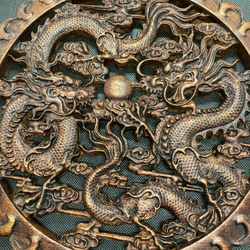 - 美術品・アンティーク・コレクション > 工芸品 > 中国 古砚台 大判サイズ 双龍戯珠図刻 木製蓋・台付 時代物 双龍戯珠 (龍) 参次元彫刻『極』 (アンティーク調) 透かし彫 楠