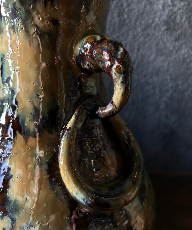 - 美術品・アンティーク・コレクション > 工芸品 > 民陶 小鹿田焼 流釉 双耳広口大壺 花器 インテリア 骨董品 小鹿田焼の花器/流釉/双耳広口大壺/古美術 | 骨董・アンティークの